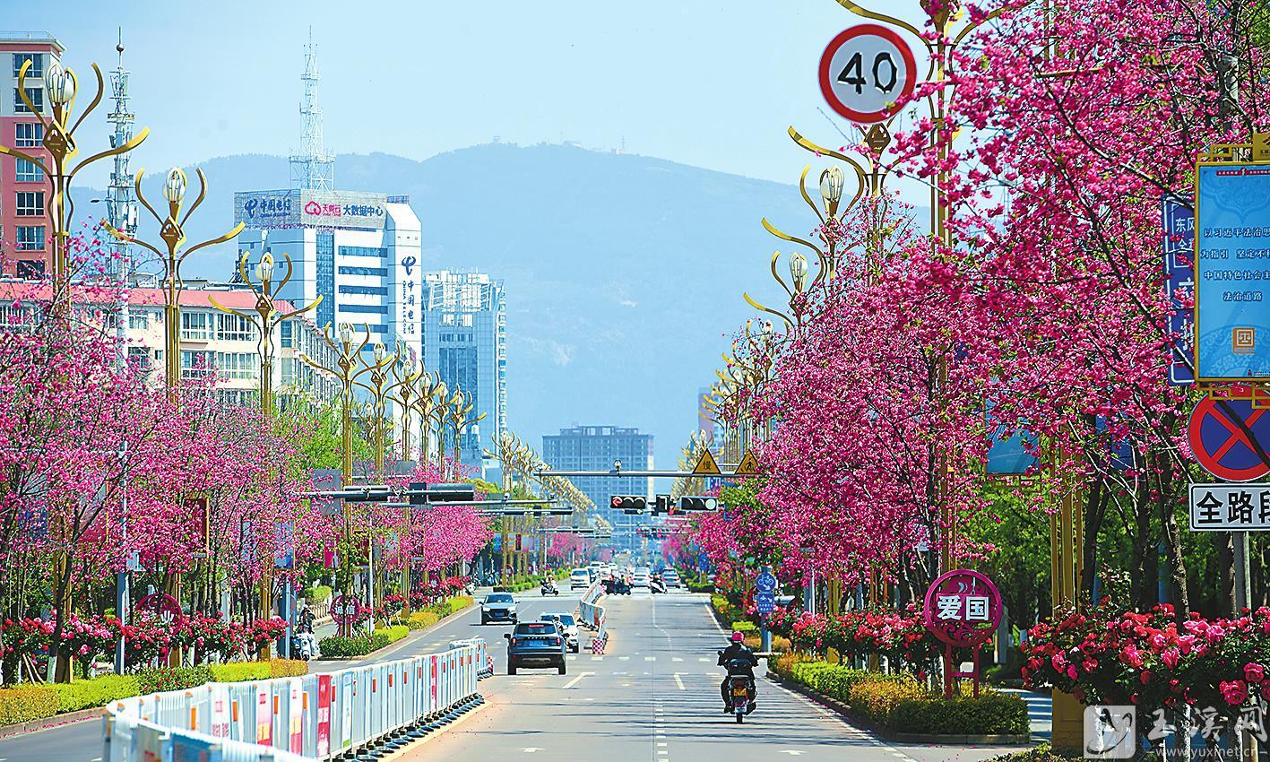 春分刚过,红塔区东风南路新栽种的樱花沿道盛放,与苍翠行道树、明艳月季相映成趣,一条“樱花大道”在春日里舒展成画。近年来,玉溪市委、市政府坚持以人民为中心,大力推进城市品质提升行动,高标准完成东风路绿化美化与道路改造,通过科学增绿添彩、优化慢行空间,同步提升城市颜值与功能,让城市建设既有“面子”又有“里子”。(玉溪市融媒体中心记者 李冉 摄)