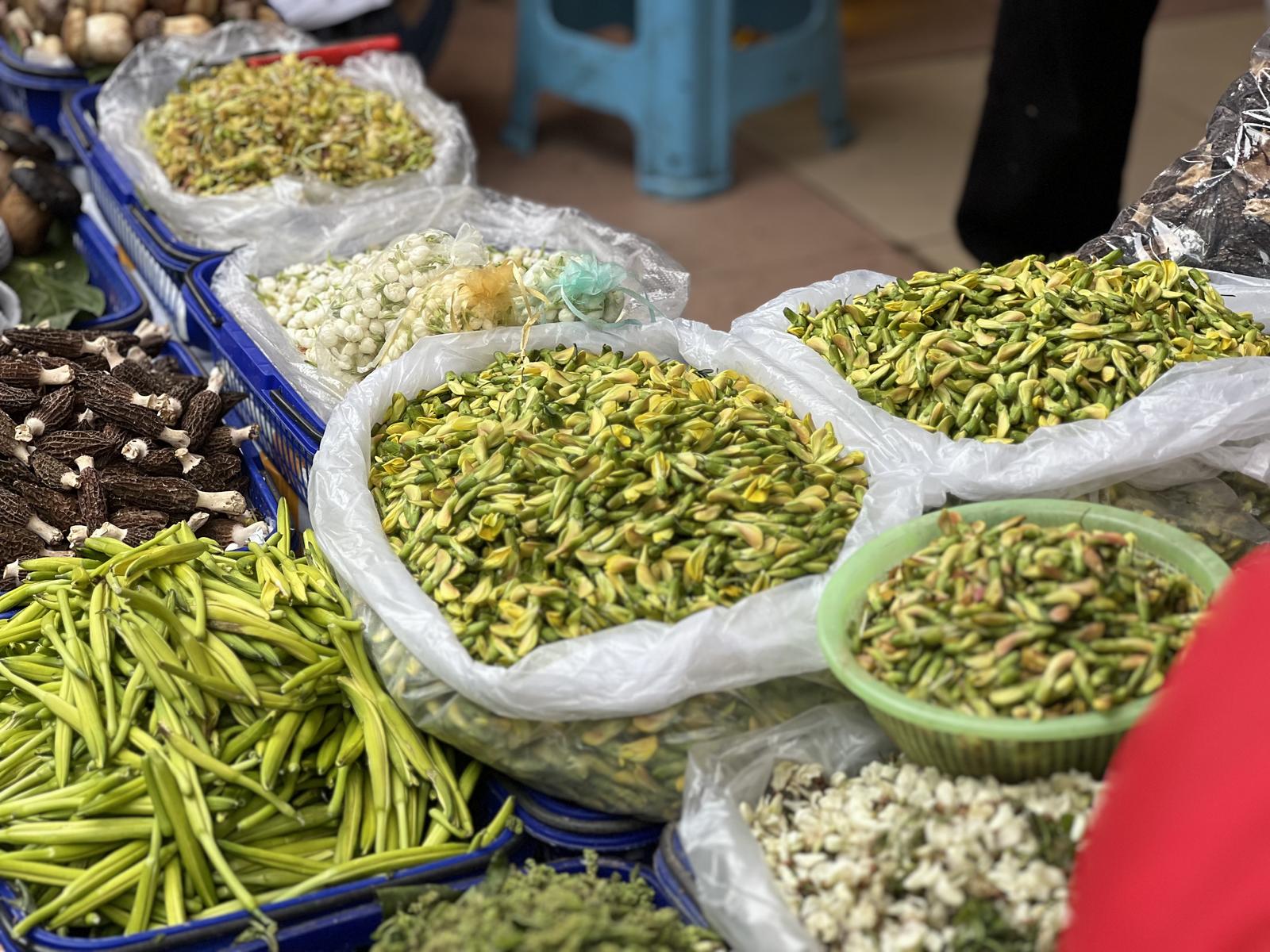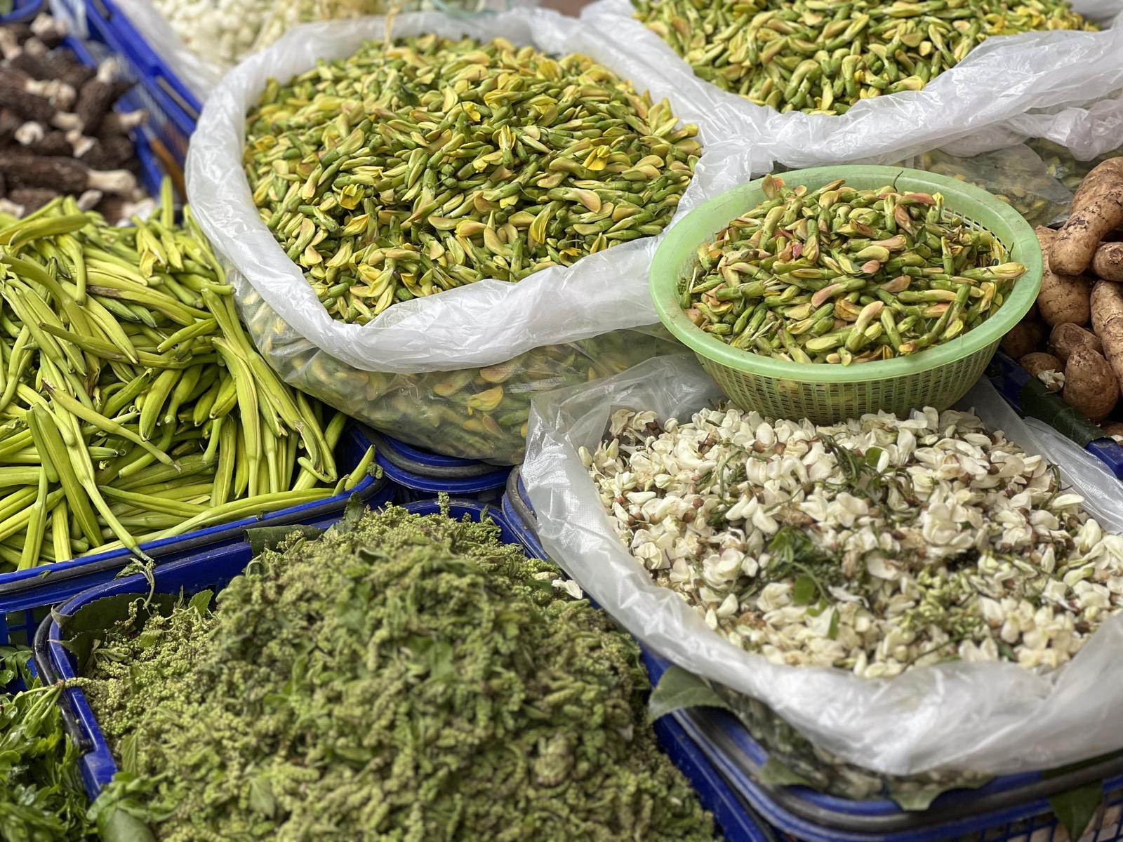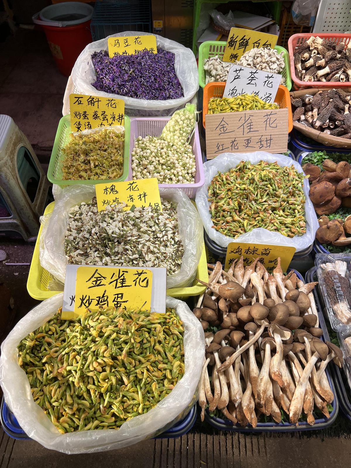 每到春日,农贸市场里食花的热闹便如期上演,一筐筐带着露水的鲜花整齐陈列。30日下午,记者来到篆新农贸市场,市场里棠梨花、金雀花、马豆花、石斛花、苦刺花、茉莉花……一筐筐鲜花整齐陈列,鲜嫩欲滴,成为抢手的“时令美味”,往来的市民、游客精心选购,只为把这份春日限定的鲜味端上餐桌。