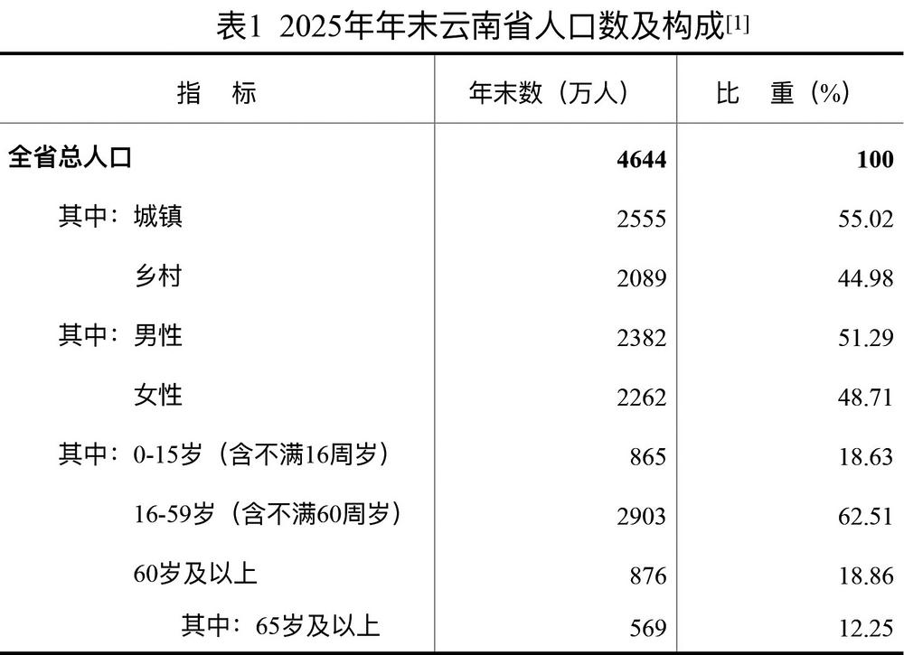 表1 2025年年末云南省人口数及构成[4]