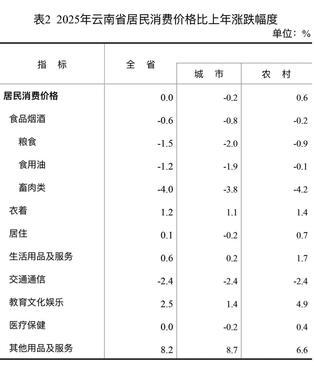 表2 2025年云南省居民消费价格比上年涨跌幅度