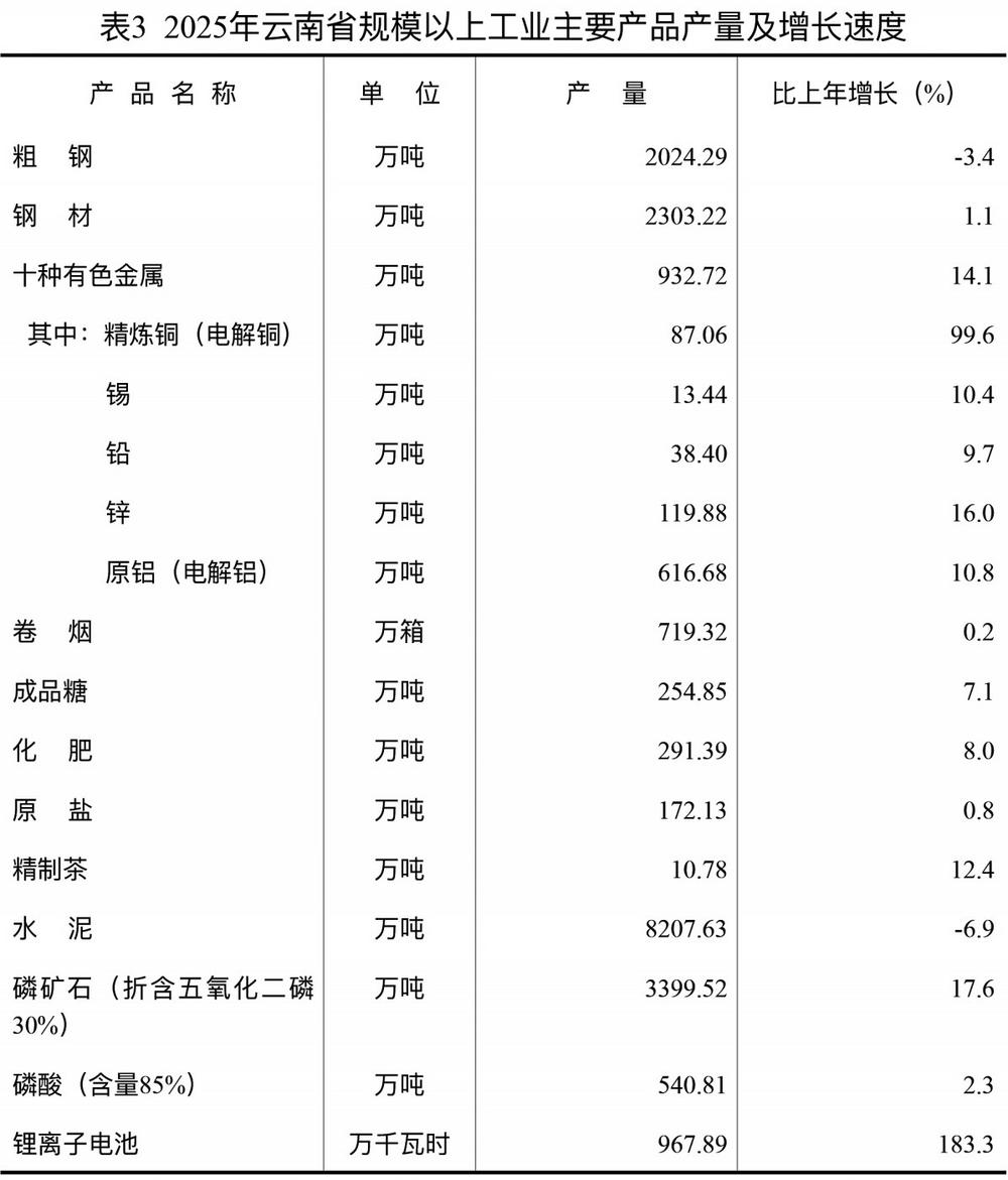 表3 2025年云南省规模以上工业主要产品产量及增长速度