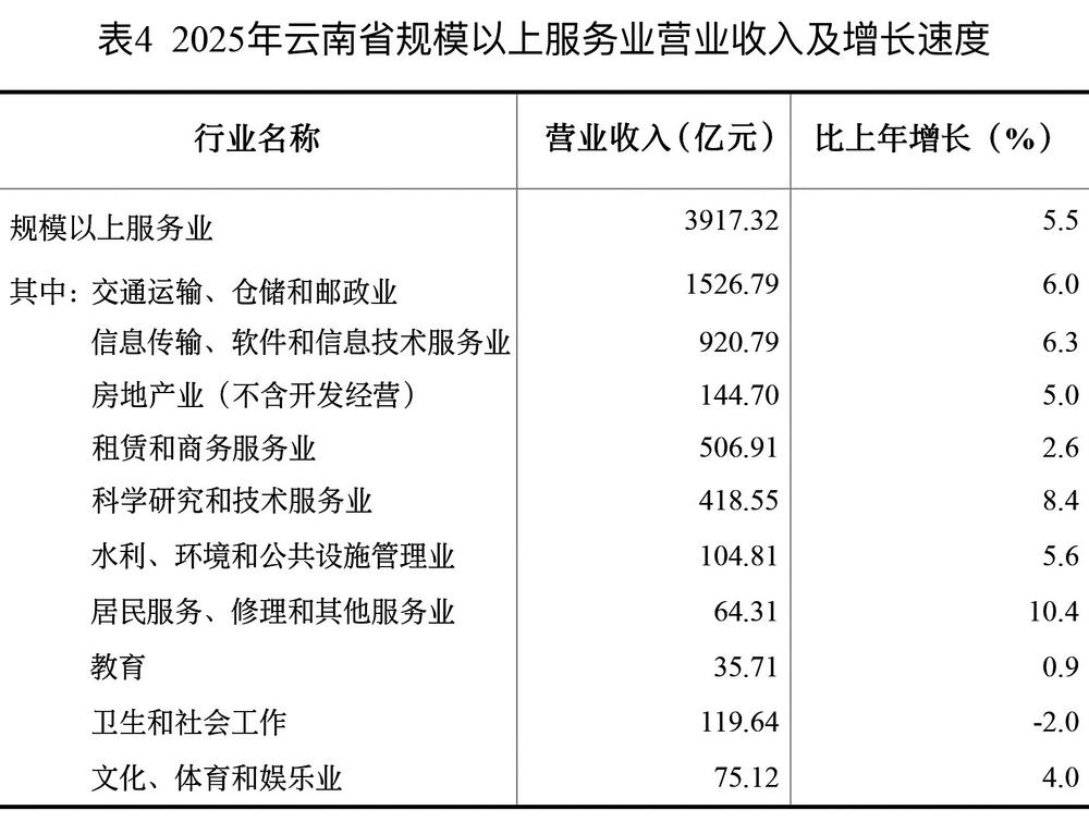 表4 2025年云南省规模以上服务业营业收入及增长速度