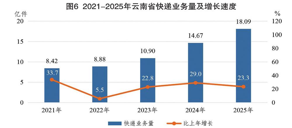 图6 2021—2025年云南省快递业务量及增长速度