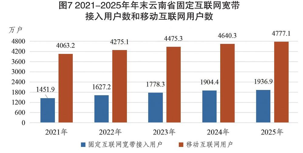 图7 2021—2025年年末云南省固定互联网宽带接入用户数和移动互联网用户数