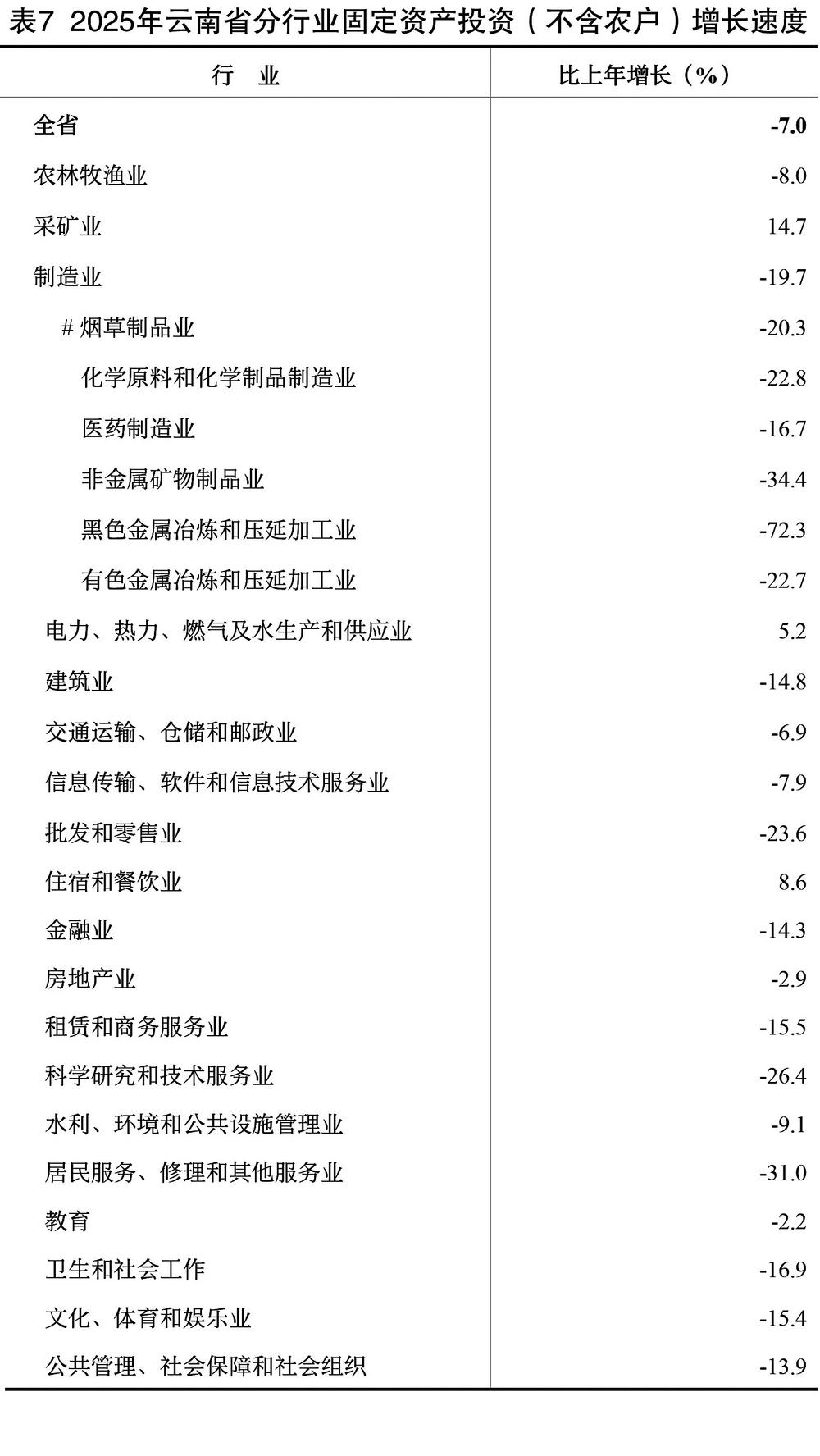 表7 2025年云南省分行业固定资产投资(不含农户)增长速度