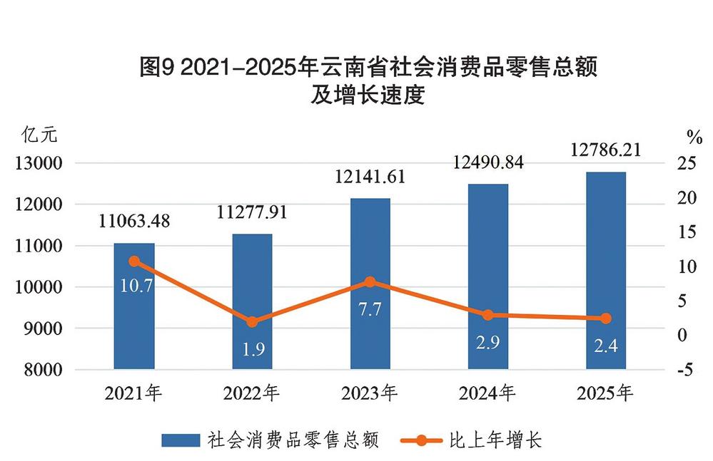 图9 2021—2025年云南省社会消费品零售总额及增长速度