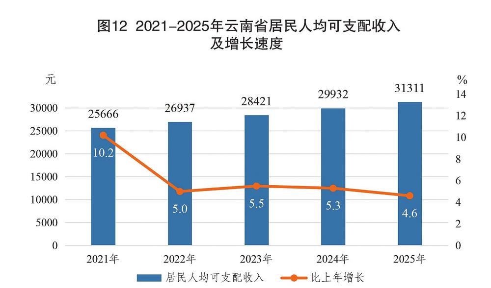 图12 2021—2025年云南省居民人均可支配收入及增长速度