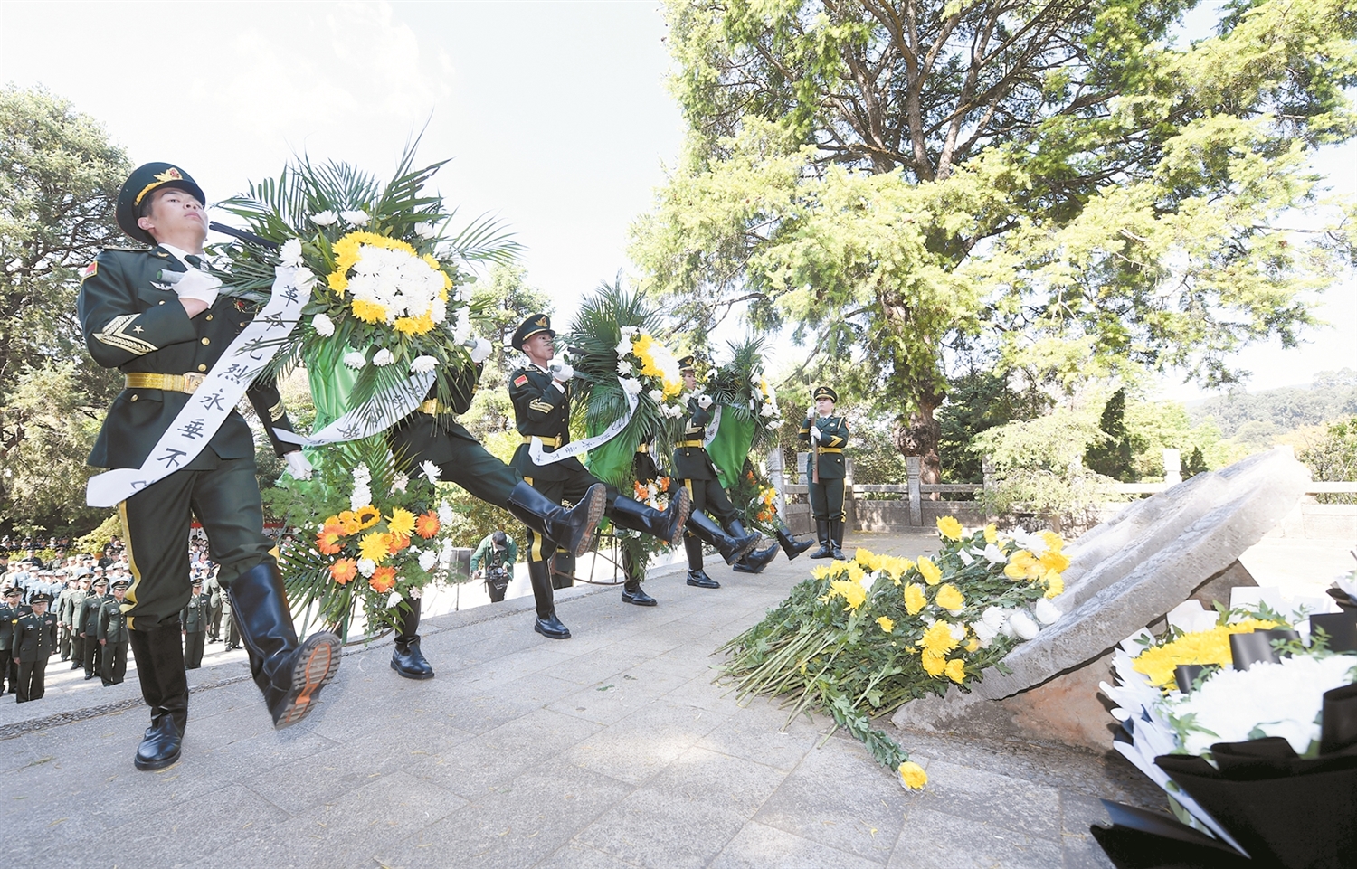 10时30分,仪式在庄严的国歌声中开始。全体人员肃立默哀,向革命先烈致以深切哀思。礼兵迈着铿锵步伐,护送花篮缓步走向烈士墓。警备区首长与地方领导上前整理缎带,全体人员依次缓步绕行,献上鲜花。