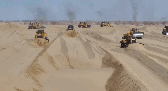 开春后,治沙现场率先登场的是推土机。宽大的推土铲像巨人的手掌,借着强劲的动力,把高耸的沙峰削平,填入低洼处。初步推平后,后方的平地机反复将沙面平整、压实。这种“先削峰填谷、再精细平整”的模式,让原本随风飘散的流沙,具备了种树的条件。