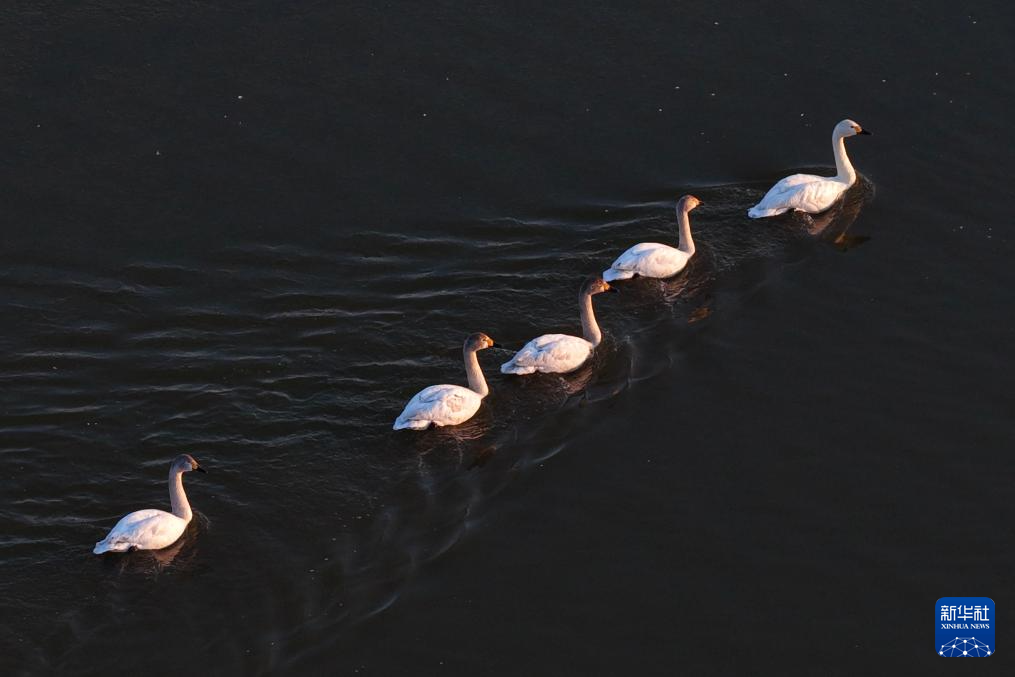 这是4月5日在松花江富锦段一处水域拍摄的天鹅(无人机照片)。新华社发(刘万平摄)