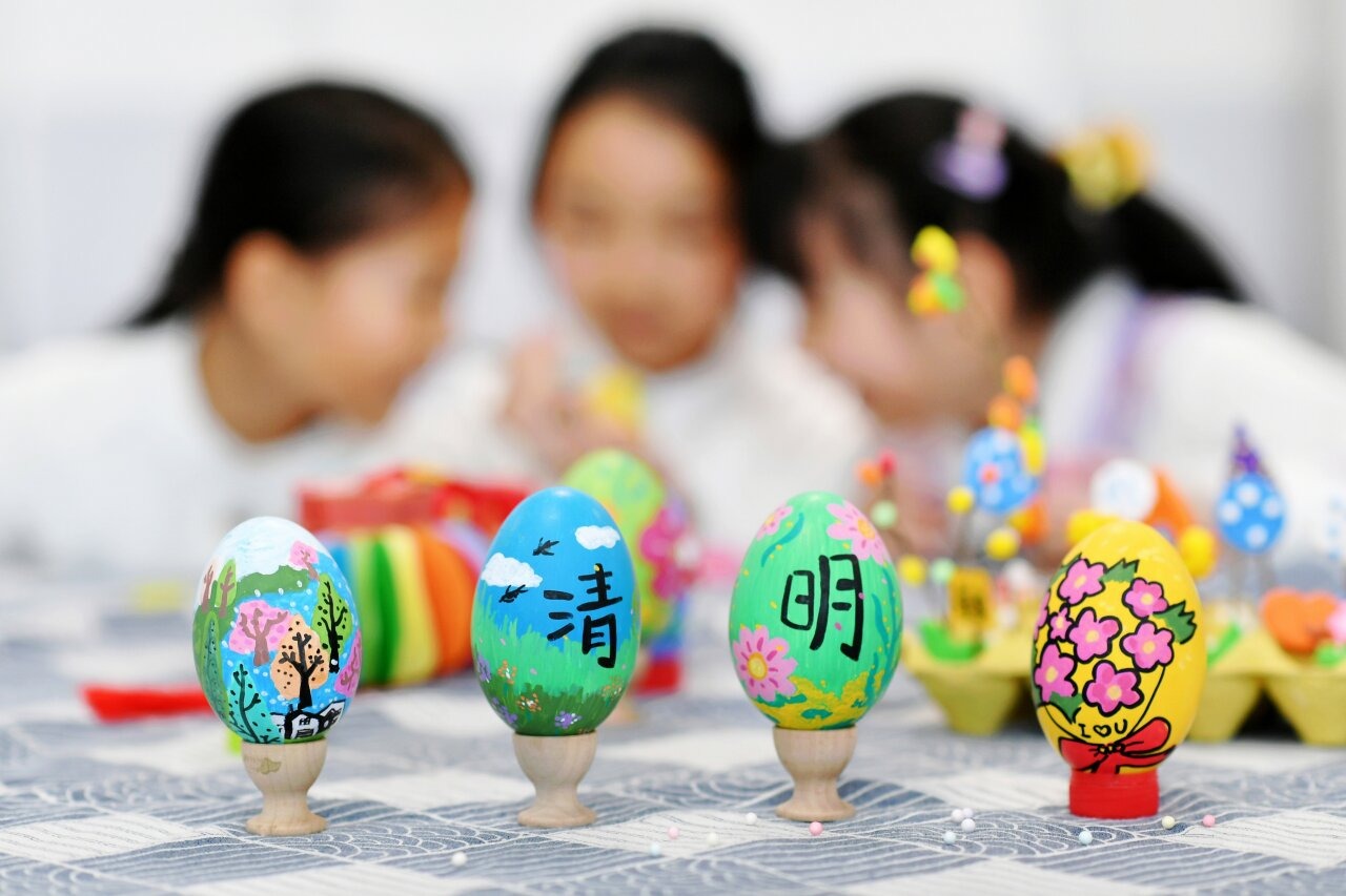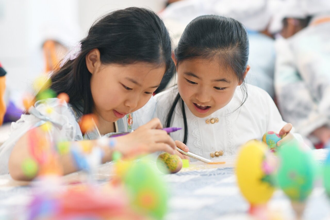 在山东省青岛市市北区杭州路小学开展的“多彩民俗迎清明”主题活动上,学生们在绘制五彩蛋。