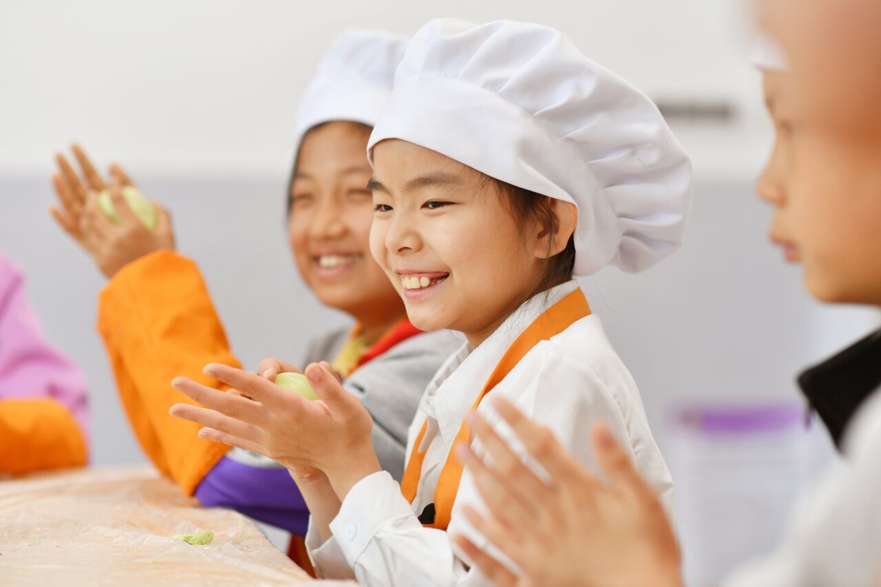 在山东省青岛市市北区杭州路小学开展的“多彩民俗迎清明”主题活动上,学生们在学做青团。