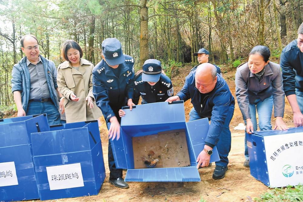 图为工作人员在林区放飞鸟类。云南省林业和草原局供图