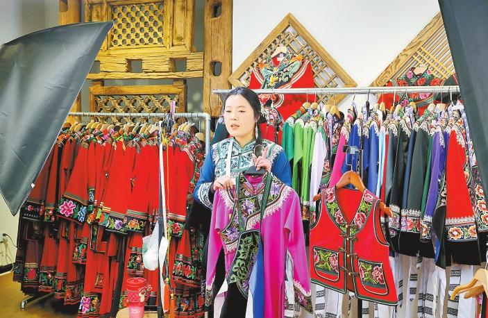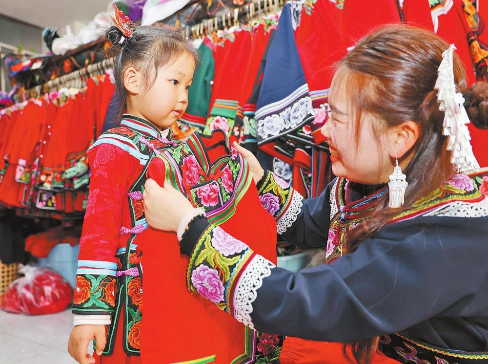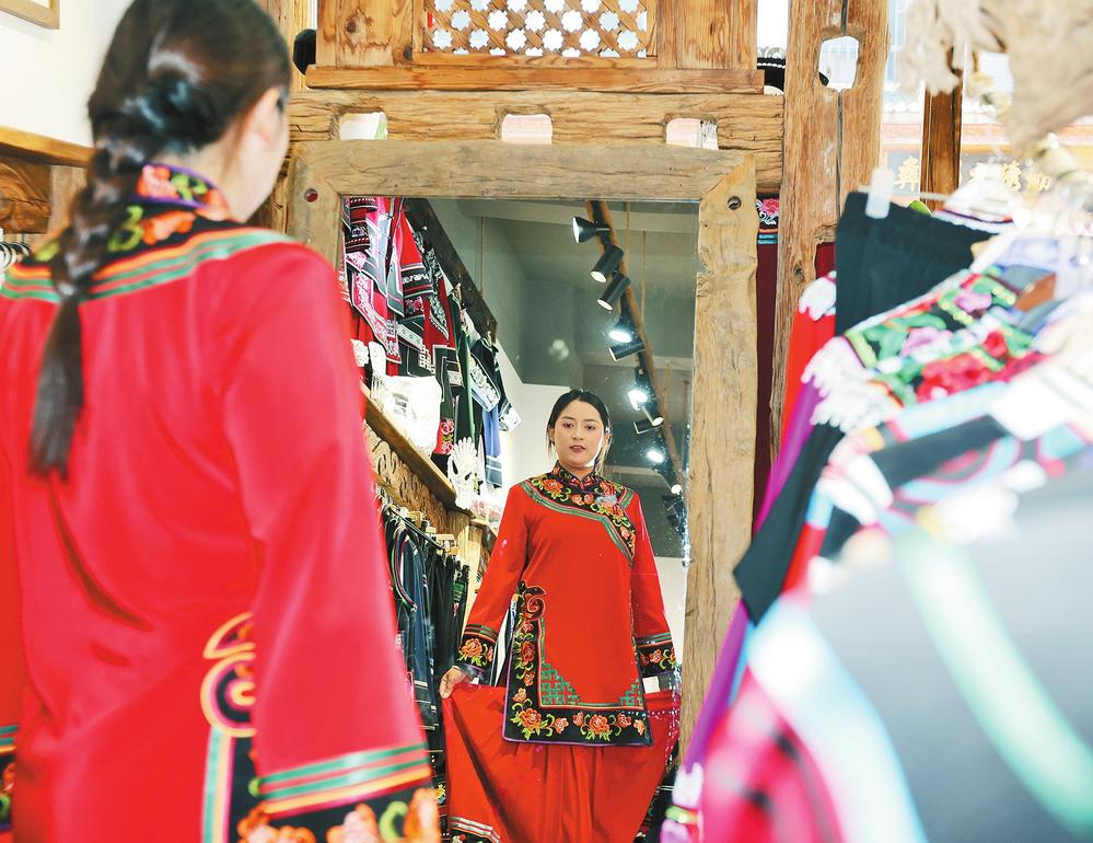“古夷服饰”店里,一位顾客正在试穿彝绣服装。