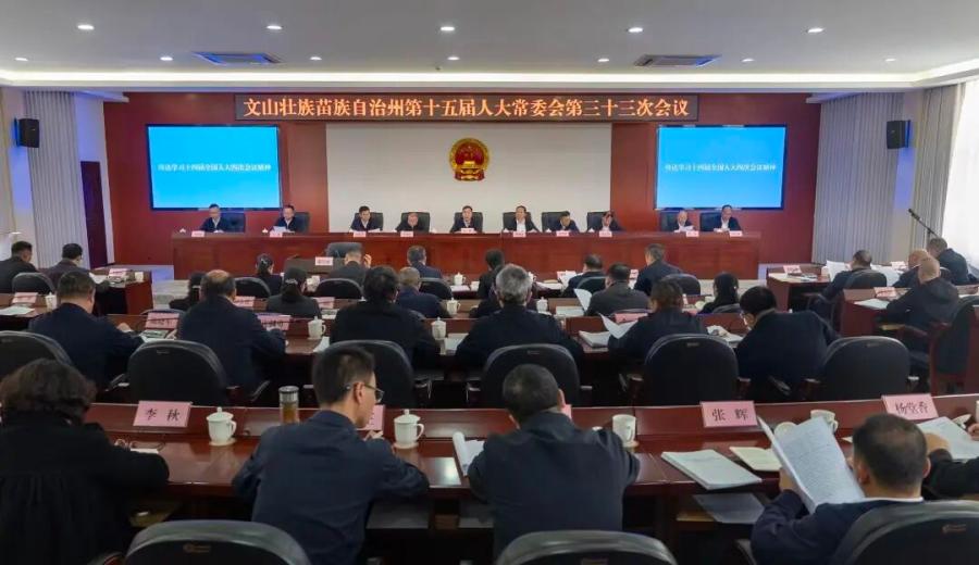 文山州人大常委会召开州十五届人大常委会第三十三次会议,传达学习十四届全国人大四次会议精神。文山州人大常委会 供图