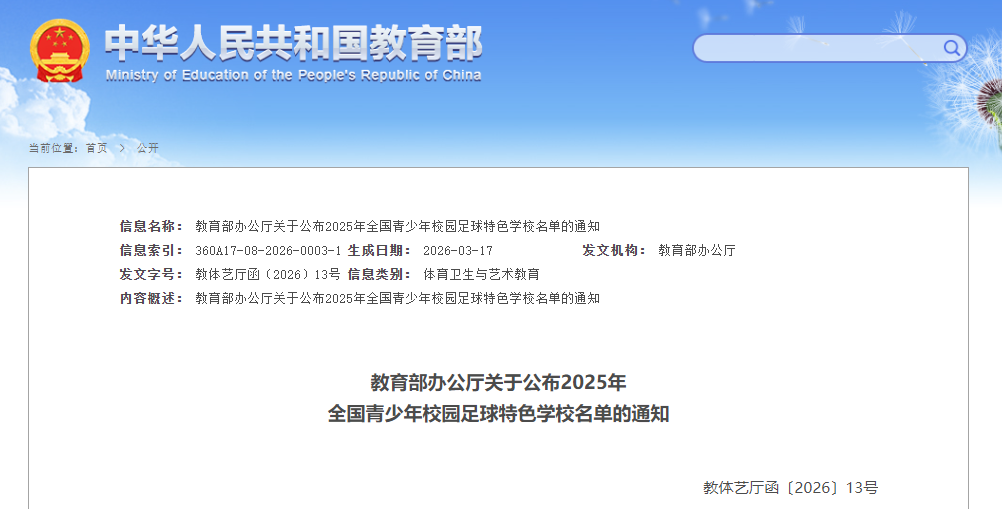 近日,教育部办公厅发布《关于公布2025年全国青少年校园足球特色学校名单的通知》。经有关学校自主申报、专家评审、省级教育行政部门审核推荐、社会公示等程序,教育部认定并命名全国青少年校园足球特色学校4928所。