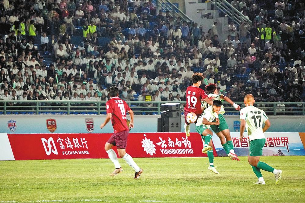 红河队球员(红衣)与普洱队球员争顶头球。云南日报记者高玥/摄