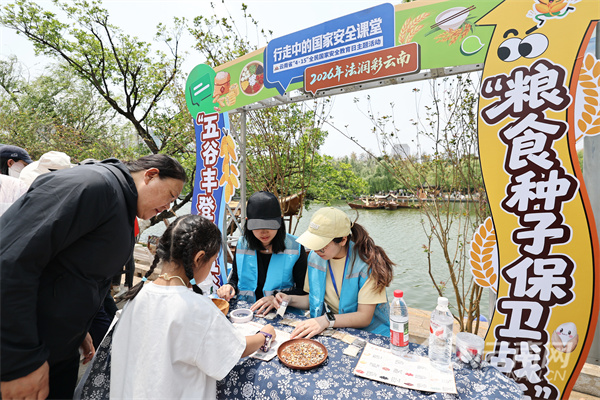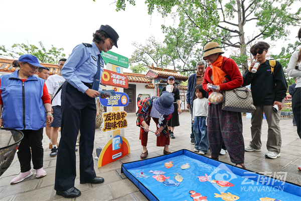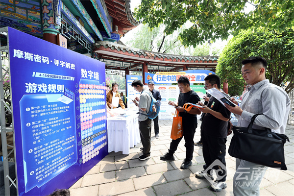 在阮堤,“阮元劝农”情景讲堂吸引了不少市民围观。身着清代服饰的演员以历史人物阮元为线索,讲述云南农耕发展与现代粮食安全的关系。不少市民在这里体验“五谷辨识挑战”,通过亲手触摸稻、黍、稷、麦、菽,感受“中国人的饭碗要牢牢端在自己手中”的深意;在唐堤,生态环境保护工作人员和志愿者结合翠湖鸟类资源,向群众讲解生物多样性保护、外来物种入侵防范等知识;在中心区,灯谜、汉服礼仪、非遗体验等活动吸引许多市民驻足参与,大家在轻松互动中了解文化安全相关内容;在观鱼楼,市民不仅要利用磁吸鱼竿精准钓出“AI换脸”“杀猪盘”等反诈纸鱼,还要在日常用品中找出隐藏的“窃听器”,气氛紧张刺激;九曲桥围绕网络安全与密码安全设置“九曲寻真”闯关体验,把钓鱼链接识别、弱密码风险、Wi-Fi陷阱、隐私保护、谣言甄别等常见网络风险融入关卡任务,同时设置摩斯密码寻宝等互动,让群众在解密与打卡中学习密码安全知识。