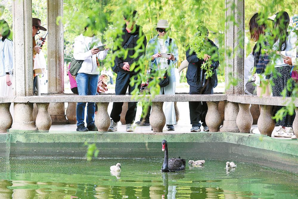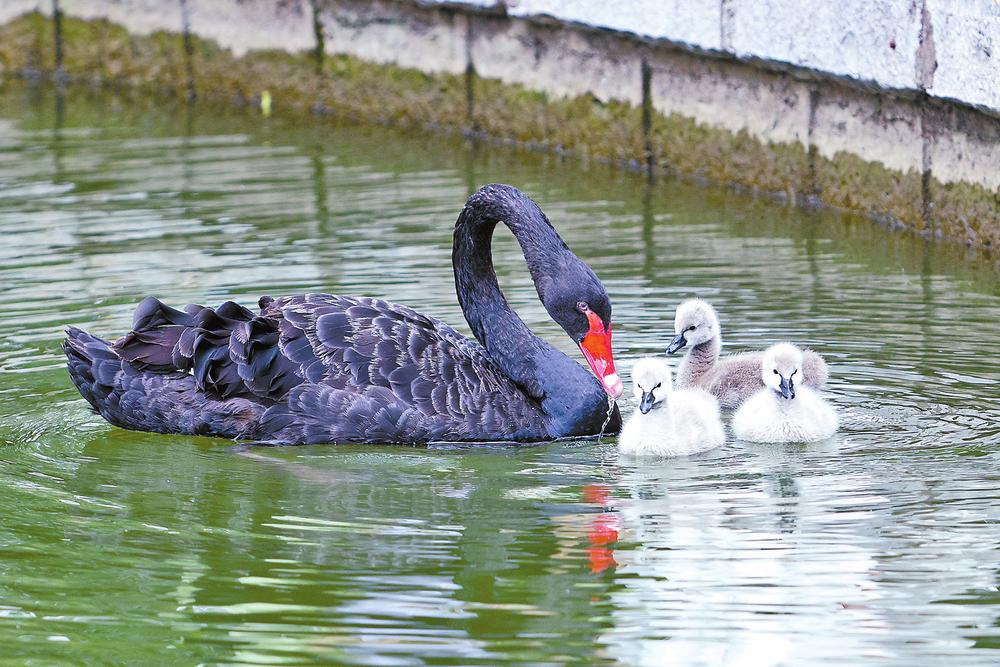 近日,昆明翠湖公园传来喜讯,园内九龙池饲养的黑天鹅成功孵化出4只天鹅宝宝。这些小天鹅一亮相就成了公园里的“人气明星”。它们全身覆盖着蓬松白灰绒,紧紧跟随着黑天鹅妈妈,在碧波间游弋、觅食,不时发出稚嫩的鸣叫,萌态十足,吸引了众多市民游客驻足拍照。(云南日报 记者高吴双/摄)