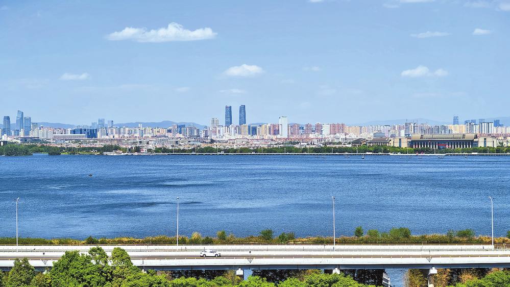 春日,远眺昆明主城区,滇池水面开阔澄澈,城市天际线清晰舒展,现代化建筑与湖光山色交相辉映,尽显昆明“湖滨春城、山水花都”独特风貌。