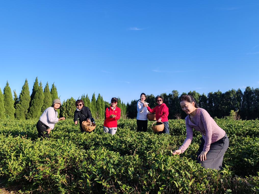 在山东日照瀚林春茶博园内,游客正在体验采茶。新华社发
