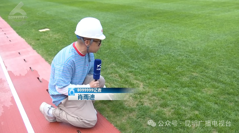 8099999记者 肖雨迪:“我现在就在拓东体育场内,目前场馆草皮,跑道铺设有条不紊的进行中,可以满足国际综合赛事需求,一大亮点就是蓝花楹主题看台与赤红色的体育场相得益彰,凸显大气不失灵动而时尚。”