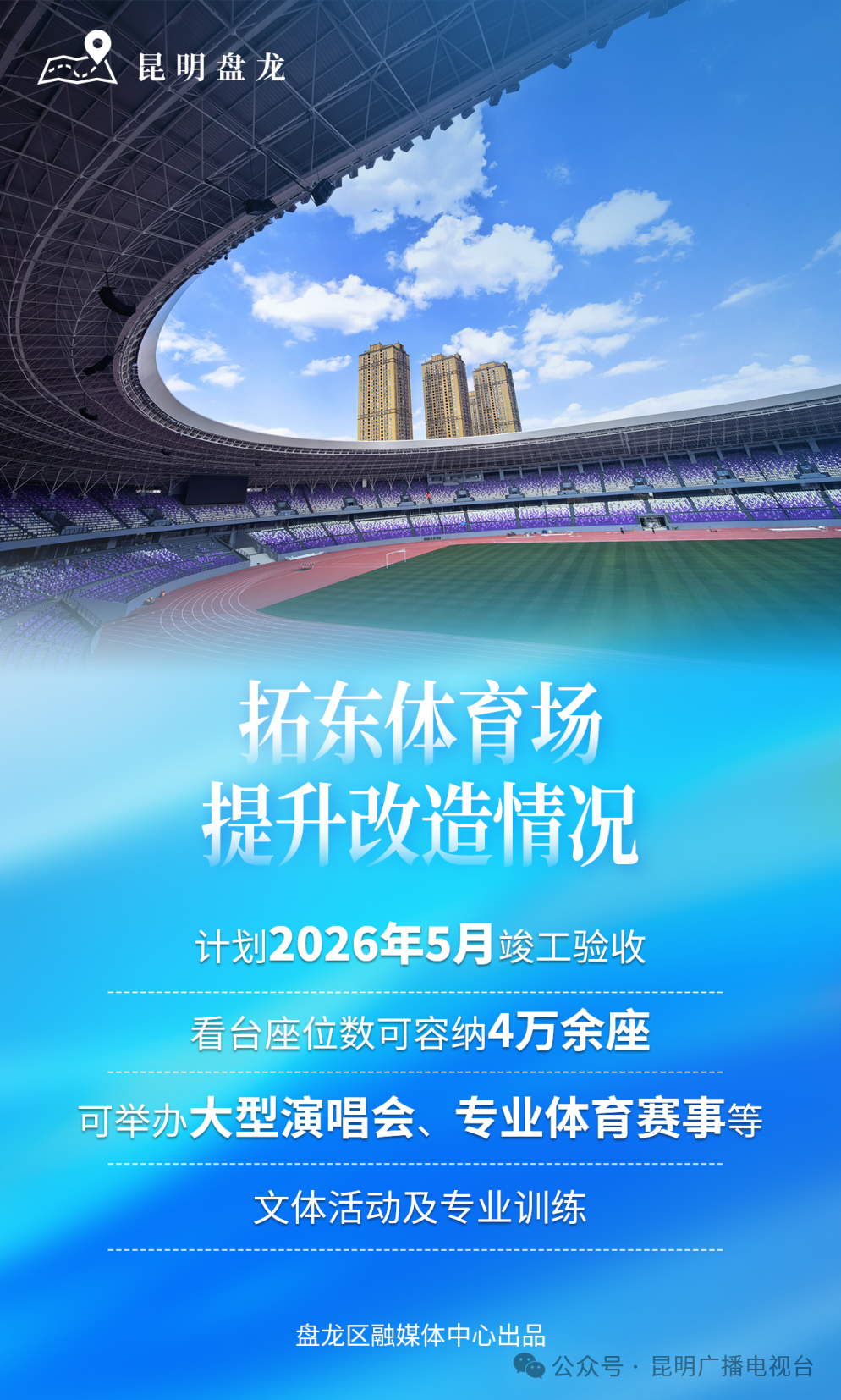项目2025年5月正式开工建设,计划2026年5月竣工验收。改造完成后,拓东体育场将成为看台座位数可容纳4万余座的现代化甲级综合性体育场,满足8度设防要求,场地赛事灯光照明满足高清转播要求,配备满足足球A级赛事需求的功能用房,独立VIP包间、贵宾休息室等配套设施。可举办大型演唱会、专业体育赛事等文体活动及专业训练。