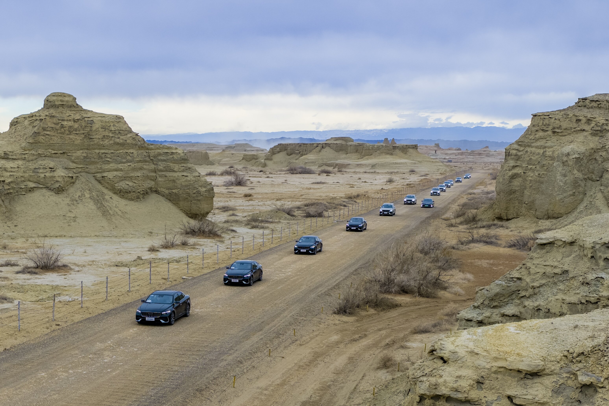 4月18日,克拉玛依市乌尔禾区乌尔禾镇万亩胡杨林,媒体试驾活动在林中举行。闵勇摄