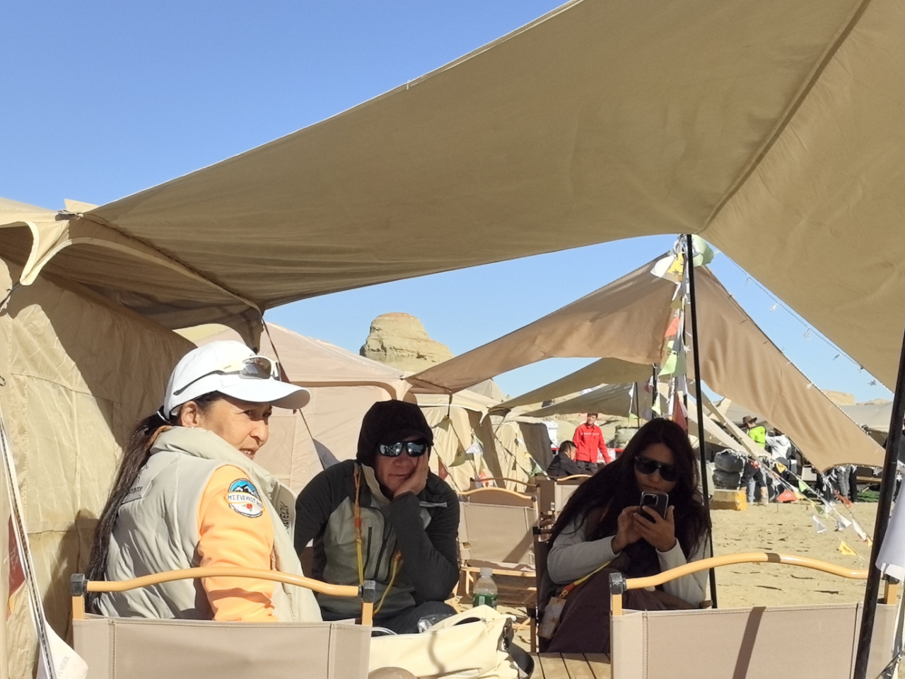 4月18日,乌尔禾区世界魔鬼城景区,游客在帐篷下赏景。崔文娟摄