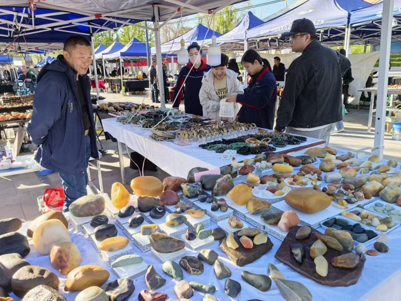 4月18日,在“荒野极境 奇遇乌尔禾”2026新疆特种旅游节荒野市集的乌尔禾金丝玉特色展示区人来人往。苗传葳摄