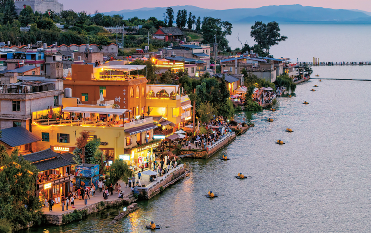 线路三:古村花韵人文线——探访卧龙古渔村、海晏村,在青瓦石墙间赏繁花绽放、观日落、体验渔家民俗、品尝滇味农家菜,一站式感受滇池畔的烟火乡愁。