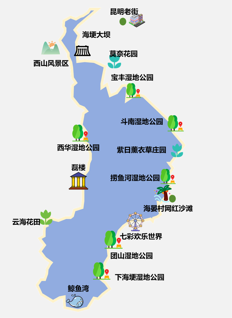 线路二:湿地踏青治愈线——漫步海洪湿地、捞渔河湿地、王官湿地等生态绿廊,栈道漫步、野餐露营、追滇池日落,沉浸式吸氧放松。