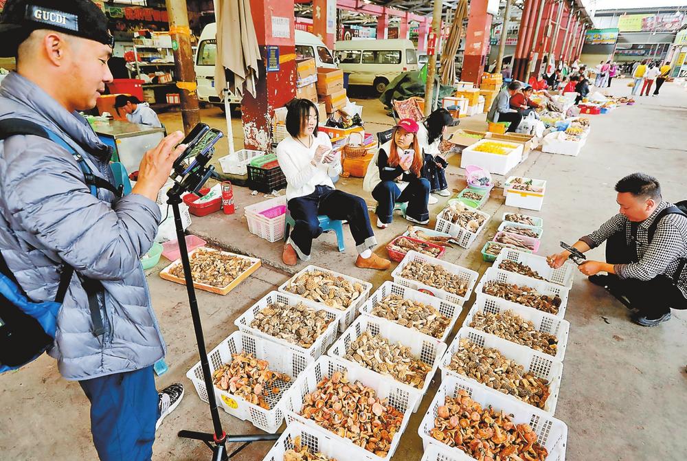 4月26日,在云南木水花野生菌交易中心,野生羊肚菌、谷熟菌率先上市,少量鸡枞菌、牛肝菌、青头菌陆续入市,引得国内外游人前来尝鲜。作为全国最大的野生菌交易市场,这里汇聚了鸡枞、松茸、干巴菌、青头菌、牛肝菌等257种野生菌,交易品种覆盖40余个国家和地区。图为主播直播带货野生菌。(云南日报 记者杨峥)
