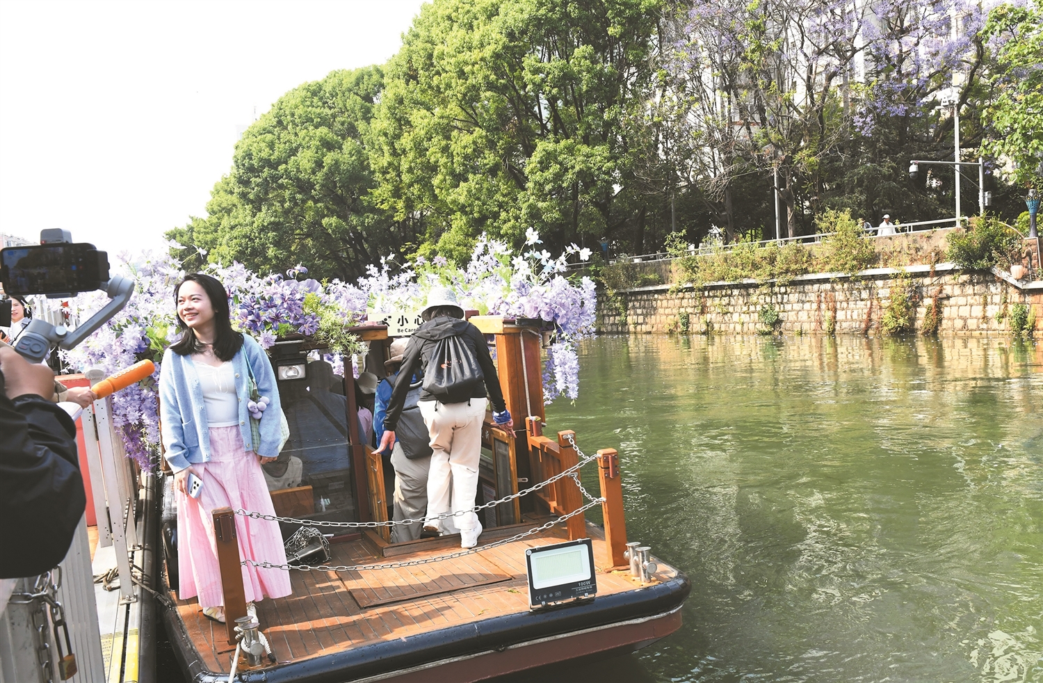 图为市民、游客乘船观赏盘龙江两岸蓝花楹。