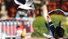 市民游客冒雨投食喂鸥 大美春城情暖新朋老友