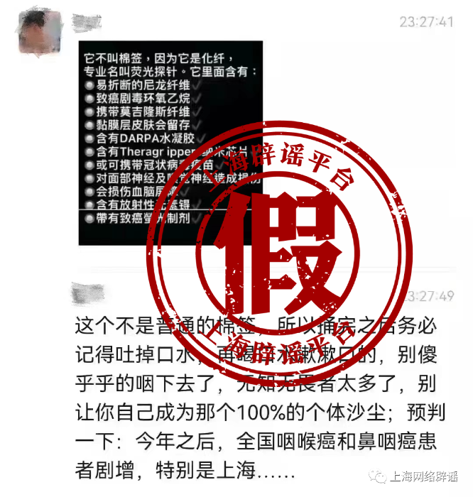 上海辟谣平台再次澄清:正规厂家出品的采样拭子无毒,网传消息完全是无稽之谈。
