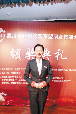 获奖感言:我很高兴能够获得“2015昆滇银行服务观察暨职业技能大赛”金牌大堂经理的称号,在以后的工作中,我一定会更加努力。