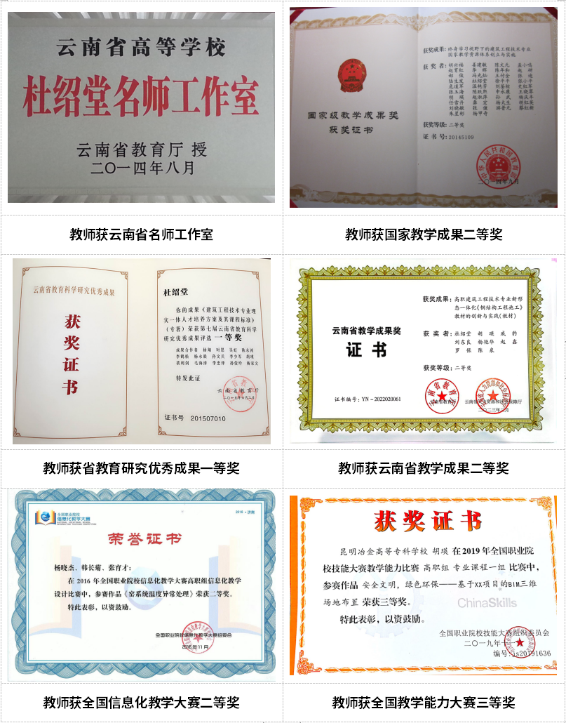 学院现有国家教学资源库课程1门,国家“十三五”规划教材2部,国家“十四五”规划教材4部,省级精品课程5门。教师获国家教学成果二等奖1项,获云南省教育科研优秀成果一等奖1项,获云南省教学成果二等奖1项,获教学能力大赛国赛二等奖1项,三等奖1项,省赛一等奖5项、二等奖2项。