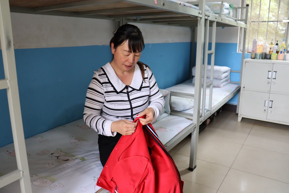生活老师给学生衣服钉扣子