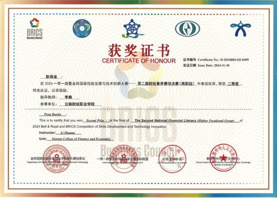 2024一带一路金砖国家技能发展与技术创新大赛——第二节财经素养赛项决赛(高职组)二等奖