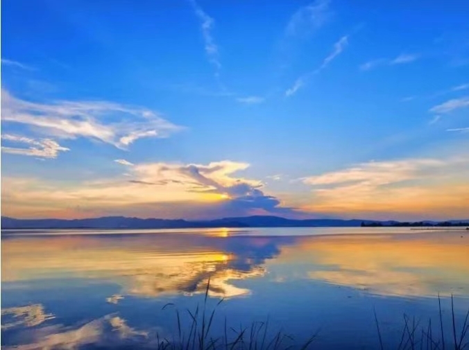 ရေကန်ဘေးရှိ ပျဉ်ခင်းလမ်းကျဉ်းသို့ လမ်းလျှောက်ရင်း နေဝင်ဆည်းဆာသည် အလှဆုံးသော အချိန်ကို ကြိုဆိုလာသည်။ ကောင်းကင်မှ နေရောင်ခြည်များသည် ဖြာဆင်းလာကာ ရေကန်မျက်နှာပြင်ပေါ်တွင် ရွှေရောင်လမ်းတစ်ခုကို ဖန်တီးသည်။ ကလေးငယ်များသည် ရေတိမ်ပိုင်းတွင် လိုက်လံဆော့ကစားနေကြပြီး အနည်းငယ်နွေးထွေးသော ကမ်းခြေတွင် ၎င်းတို့၏ ခြေရာများကို အမှတ်အသားပြုကြသည်။ ရေကန်၏ အခြားဘက်ကမ်းတွင် ဝေးကွာသော တောင်တန်းများသည် နေဝင်ဆည်းဆာထဲတွင် ခရမ်းရောင် လှိုင်းလုံးများကဲ့သို့ လှိုင်းထနေကာ ကြယ်ပွင့်များ ကျရောက်လာပြီးနောက် မရေမတွက်နိုင်သော မီးအိမ်မီးတိုင်များ ထွန်းလင်းခြင်းကို စောင့်မျှော်နေကြသည်။