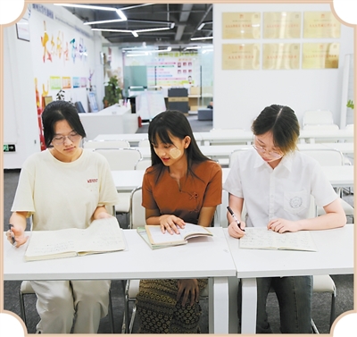 缅甸姑娘德信娇(中)正在与中国学生一起学习交流。张朝华摄