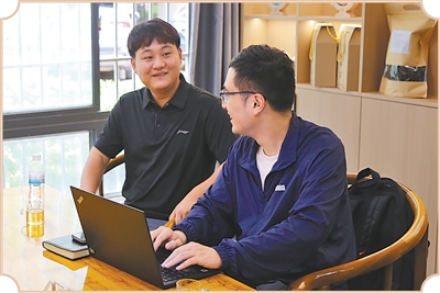 本报记者在临沧边境经济合作区缅甸大学生创业园采访雪兵伟(左)。张朝华摄