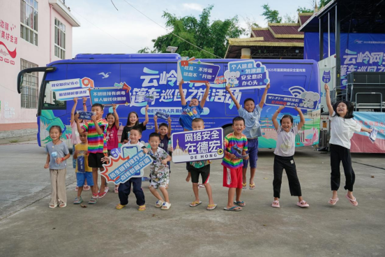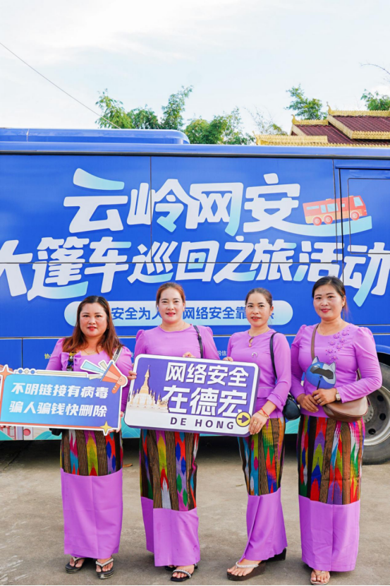 同时,还有不少身穿傣族服饰的村民来到车旁,她们手举网络安全标语牌,用灿烂纯真的笑容与“云岭网安大篷车”同框定格。这一美好瞬间既是网络安全融入日常生活的鲜活注脚,更是群众对网络安全宣传的暖心认可。