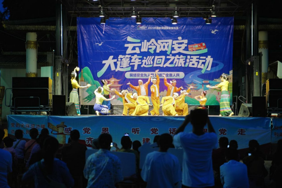 在文艺演出的烘托下,现场气氛逐渐走向高潮,演员们走下舞台,呼吁村民一同加入到戛伴光舞中。作为傣族人民最普及的集体舞蹈形式,戛伴光舞以满满的氛围感吸引了众多村民加入,以欢快动感的脚步与“个人信息勿泄露,安全意识存心头”等网络安全标语牌共舞,一同共绘网络安全“同心圆”。多数村民共同认为,能用自己熟知的形式学习网络安全知识,既轻松又亲切。