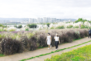图为市民漫步在滇池东岸的湿地步道
