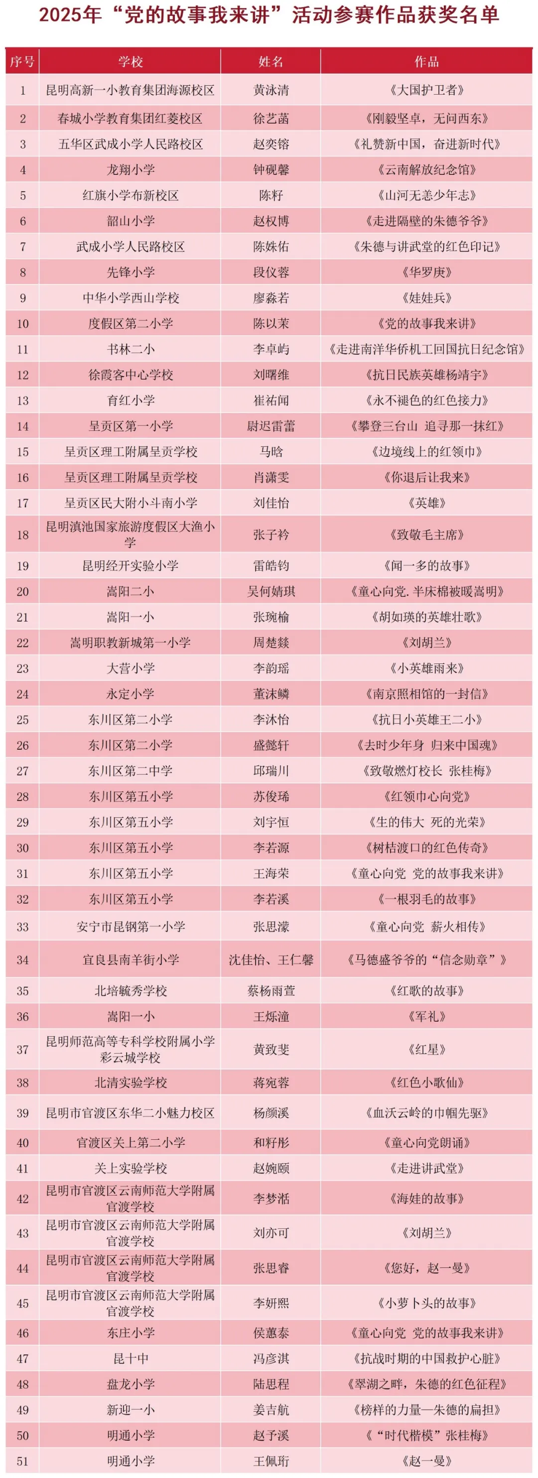 围绕“从小学习党史,永远跟党走”的中心思想,号召同学们讲述党的故事、革命的故事、英雄的故事,2025年9月至11月,昆明市在全市中小学组织开展了“童心向党·党的故事我来讲”演讲比赛,通过讲述党的故事、革命的故事、英雄的故事和身边榜样的故事,展现中小学生听党话、感党恩、跟党走,在党的关怀下树立远大理想,努力学习、成长成才。