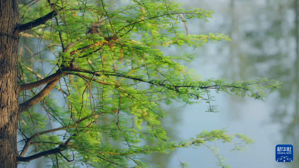 碧水如镜,倒映蓝天;鸟鸣清脆,微风轻拂,湿地草木吐露新绿。水光与春色相映成景,勾勒出一幅清新灵动的生态画卷。
