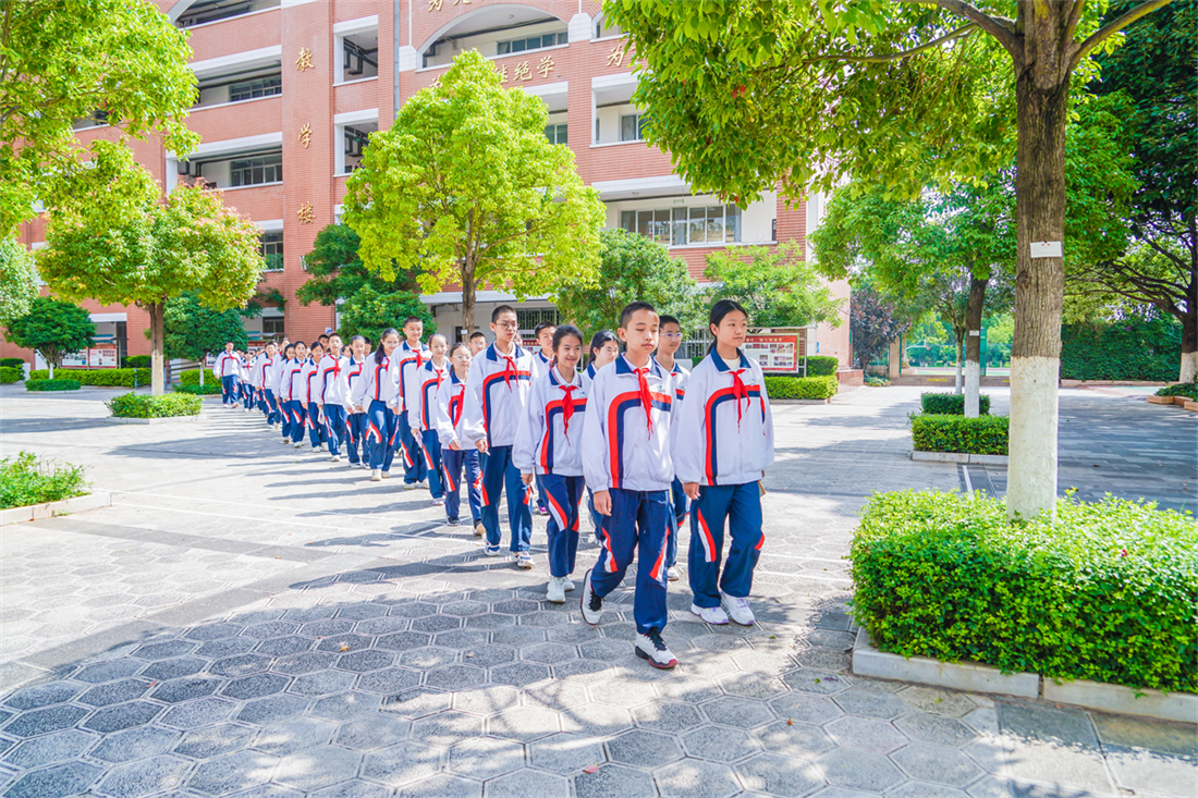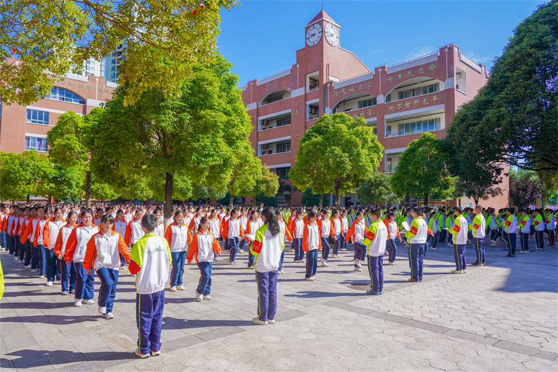铃声响起,校园瞬间沸腾。广播操舒展划一,武术操刚柔并济,“快、静、齐”的青春风采在阳光下熠熠生辉。值周班同学认真值周检查,楼梯间学生有序靠右下楼,大课间的每一个细节都体现着管理的精细与学生的自律。