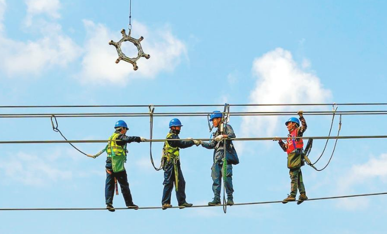 在中国云南磨憨与老挝琅南塔省交界处的热带雨林上空,一场塔间距300多米的跨境高空作业正在进行。